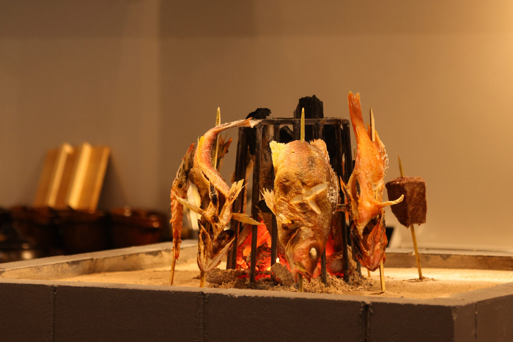 炭火の香ばしい炎で焼き上げる旬の魚や地の食材、ふっくらと炊き上げた土鍋ご飯。